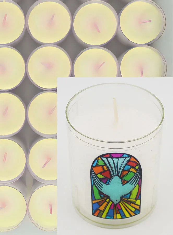 10 Votive Candles Dove Holy Spirit of Peace. Each of these candles lasts at least 20 hours. Batch of 10.