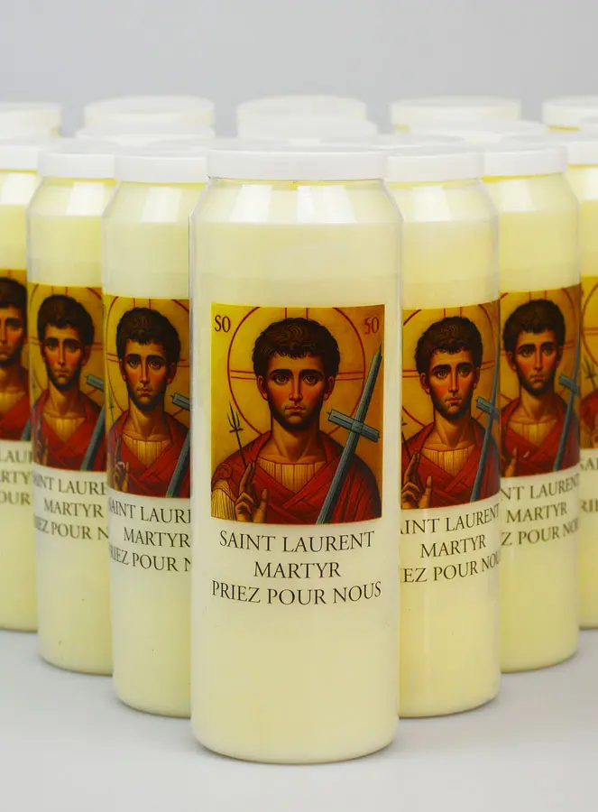 20 Novena Candles Saint Lawrence Martyr - 17.5cm. This novena candle depicting Saint Lawrence will enable you to pray your novena for 9 days. St Lawrence is invoked to heal burns, skin diseases and eczema. Patients wear a small white ribbon. A ribbon of the same fabric is tied on the statue of the saint... Saint Lawrence is also invoked to free the souls in Purgatory. Candle made with 100% vegetable oil. Burn time 9-10 days per candle. Box of 20 candles.