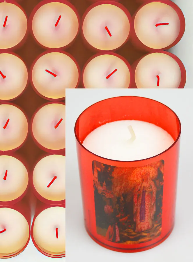 24 Our Lady of Lourdes Votive Candles - Red. Each candle has a burning time of 20 hours minimum. With the effigy of Our Lady of Lourdes. Made in France. Set of 24.
