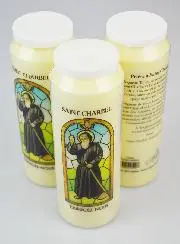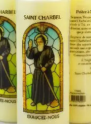 3 Saint Charbel Sanctuary candles with prayer (in French) on the back - 17.5cm. This novena candle has an image and a prayer (in French) to Saint Charbel. A novena candle is a candle that remains lit for nine consecutive days. It is prayed for during these nine days and allows you to find serenity, peace and give thanks to God through the intercession of the Saints. Use the prayer (in French) on the back of the candle to pray to Saint Charbel, invoked to receive graces or a miracle. Light this candle in your prayer corner and create a serene place to pray. Feast day: December 24th. Candle made from 100% vegetable oil. Burn time 9-10 days per candle. Set 3 candles.