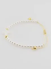 Adjustable religious shell bracelet, this pretty bracelet is made from 30 white shell beads (diameter 4mm), and adorned with a shell cross embellished with 2 golden beads.