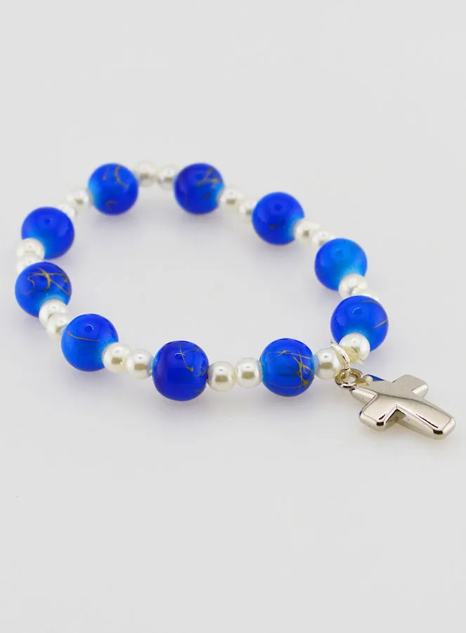 Children's bracelet - dark blue, this pretty bracelet is made of plastic beads on extra-strong elastic, with a silvery metal cross.