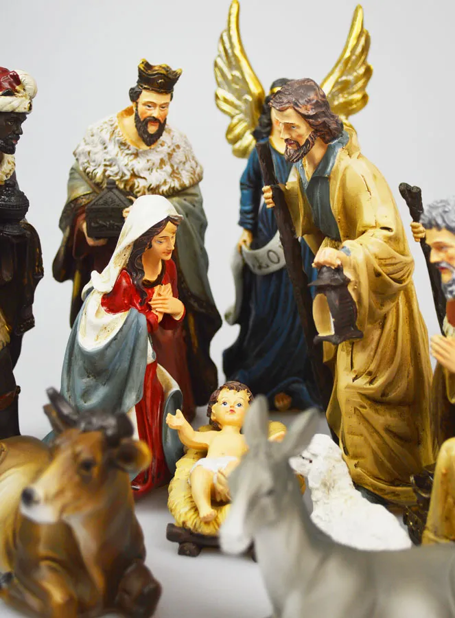Characters: Holy Family, ox and donkey, Three Wise Men, shepherd, sheep, archangel.