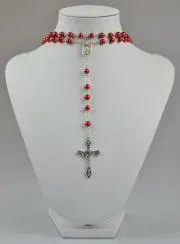 Fashion Rosary with Red Beads -60cm, this rosary is made with beads on a shiny silvery chain. Length: 60cm.