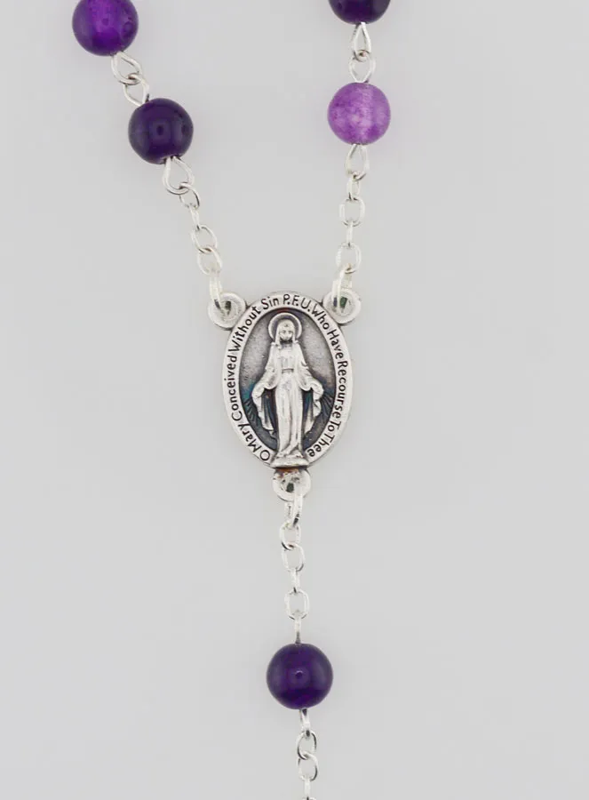 Genuine Amethyst Rosary - Silvery Chain, this beautiful rosary is made with genuine amethyst beads on a silvery chain. The beads are 6mm and the rosary is 60cm. The medal shows Our Lady of Miracles and is 16mm.