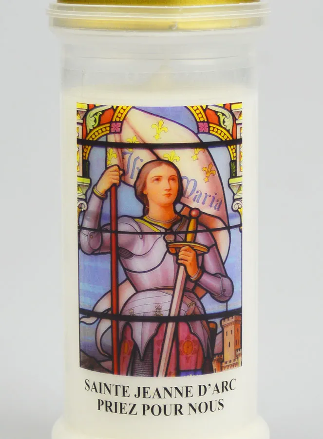 Grave Lantern Saint Joan of Arc. This candle is designed to burn for 60 hours continuously. Made in France.