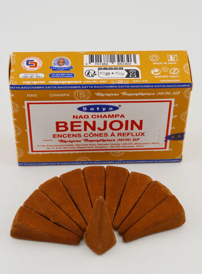 Incense Benzoin Satya - Backflow Cones, box of 10 backflow incense cones. Backflow cones are pierced at the base, allowing the smoke to escape through the bottom of the cone.