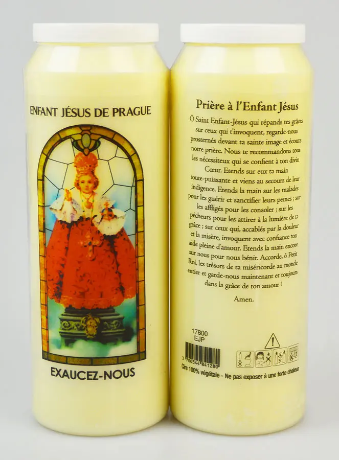 Infant Jesus of Prague Sanctuary candle with prayer (in French) on the back - 17.5cm. This novena candle has an image and a prayer (in French) of the Infant Jesus of Prague. A novena candle is a candle that remains lit for nine consecutive days. It is prayed for during these nine days and allows you to find serenity, peace and give thanks to God through the intercession of the Saints. Use the prayer (in French) on the back of the candle to pray to the Infant Jesus of Prague, invoked to receive a grace of purity and virtue. Light this candle in your prayer corner and create a serene place to pray. Feast day: January 14th. Candle made from 100% vegetable oil. Burn time 9-10 days.