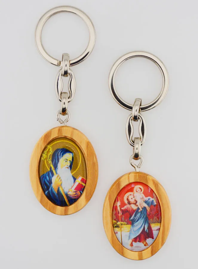 Double-sided Key Ring - Saint Christopher and Saint Benedict, this pretty double-sided olive wood key ring features two resin plates depicting Saint Christopher and Saint Benedict.