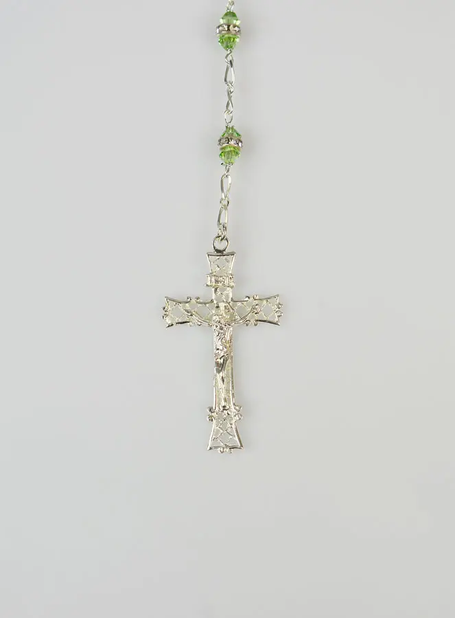 Light Green Crystal & Silver Rosary, this rosary is made of 925 sterling silver and crystal beads set in silver. Diameter of beads: 6mm, length: 52cm, cross length: 4cm, cross medal: 16mm. A beautiful piece of jewellery made in Italy by our artisan jeweller, delivered in a box.