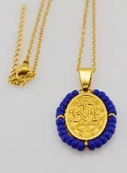Miraculous Medal + Chain - Dark Blue Beads, this superb handcrafted necklace made in France is in golden stainless steel. It consists of a 42cm anchor chain and a miraculous medal encircled with dark blue stone beads. This jewel is handmade in France, designed and made by our partner craftsman.