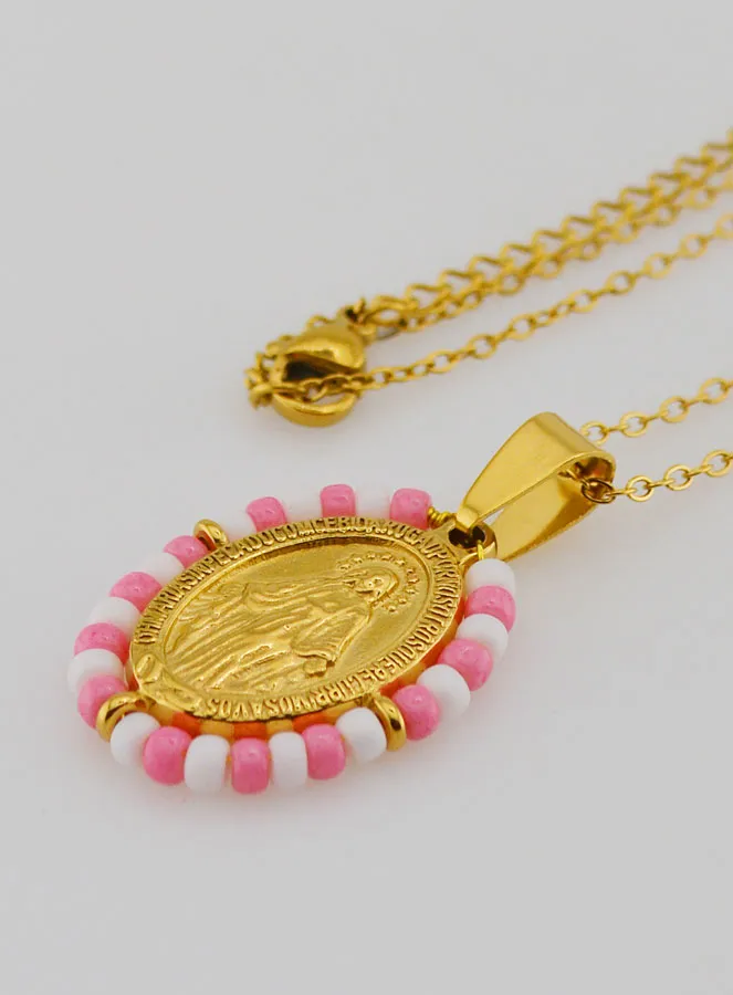 Miraculous Medal + Necklace - Pink and White Beads, this superb handcrafted necklace made in France is in golden stainless steel. It consists of a 42cm anchor chain and a miraculous medal encircled with coloured stone beads. This jewel is handmade in France, designed and made by our partner craftsman.