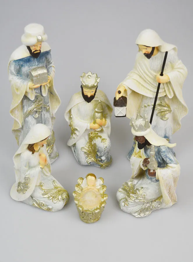 Christmas cot with 6 figures, 24cm high, superb nativity scene made up of 6 hand-painted figures in white, blue and silver resin. Each figure is 24cm high (except baby Jesus). Characters: Jesus, Mary, Joseph and the Magi (Melchior, Gaspard, Balthazar).