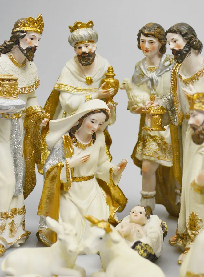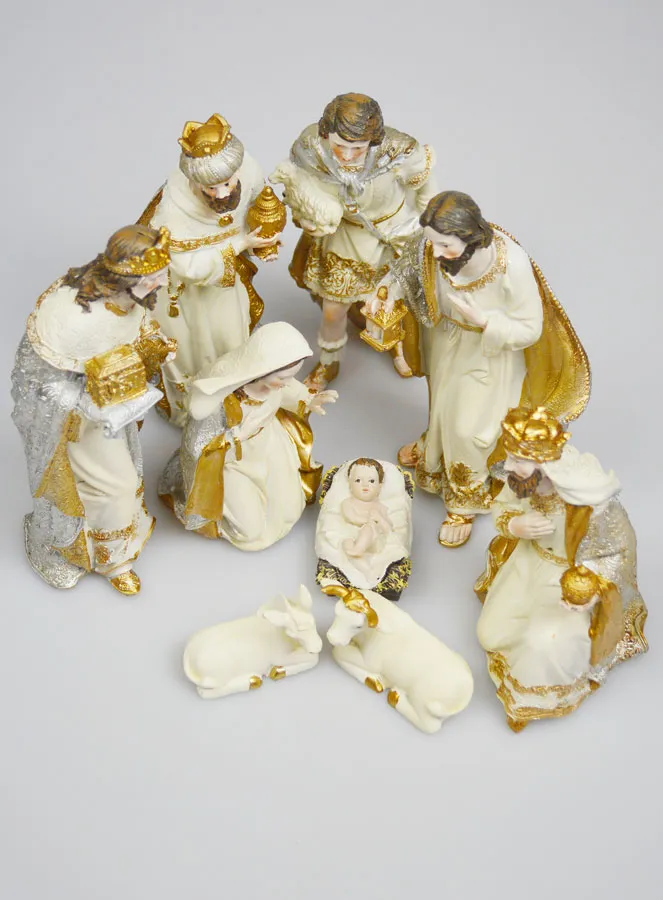 Nativity Scene with 9 figures - 18cm, this superb Nativity Scene features 9 hand-painted figures in golden and silver resin. Superb quality, an exceptional product!