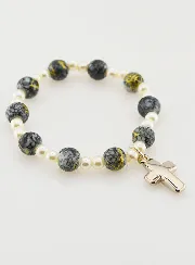 One Decade Bracelet for Children - Grey, this pretty bracelet is made of plastic beads mounted on extra-strong elastic. It contains a silvery metal cross.