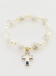 One Decade Child Bracelet - White, this pretty bracelet is made of plastic beads mounted on extra-strong elastic. It is embellished with a silvery metal cross.