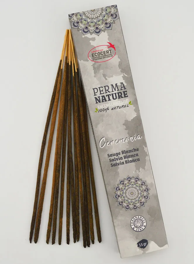 Premium Incense with Ecocert Label 15g - White Sage, these premium quality incense sticks are made from 100% natural ingredients, from the composition of the product to its packaging. Ecocert label (European certification for eco-responsible products). Box of 12 to 15 sticks, weight 15g.