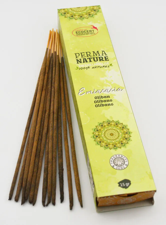 Premium Olibanum Incense with Ecocert Label, these premium quality incense sticks are made from 100% natural ingredients, from the composition of the product to its packaging. Ecocert label (European certification for eco-responsible products). Box of 12 to 15 sticks, weight 15g.