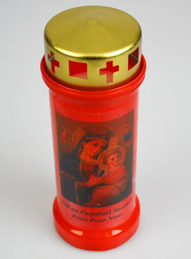 Red Grave Candle - Mary Help of Christians. Made in France. This outdoor candle is designed to burn 60 hours.