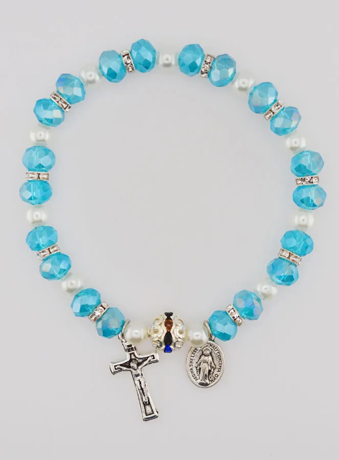 Religious Bracelet Miraculous Virgin - Pale Blue, this pretty bracelet is made up of translucent beads, white pearly beads and flat silvery metal beads with rhinestones, mounted on an elastic band size 16-18cm. It also features the Cross of Christ and the Miraculous Medal from the Rue du Bac Paris.