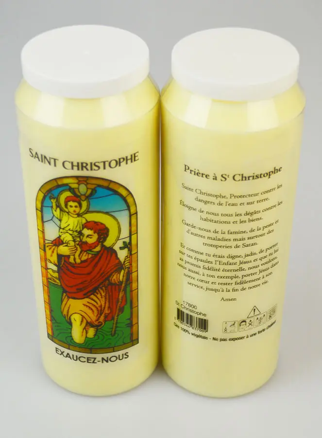 Saint Christopher Novena Candle with FRENCH prayer on the back - 17.5cm. This sanctuary candle has a picture and a prayer in French of Saint Christopher. A novena is a candle which remains lit for nine consecutive days. It is prayed during these nine days and allows you to find serenity, peace and to give thanks to God through the intercession of the Saints. Pray to Saint Christopher, invoked for protection against all dangers on land and in the water, using the prayer (in French!) on the back of the candle. Light this candle in your prayer corner and create a serene place to pray. Feast day: August 21st. Candle 100% vegetable oil. Burns for 9-10 days.