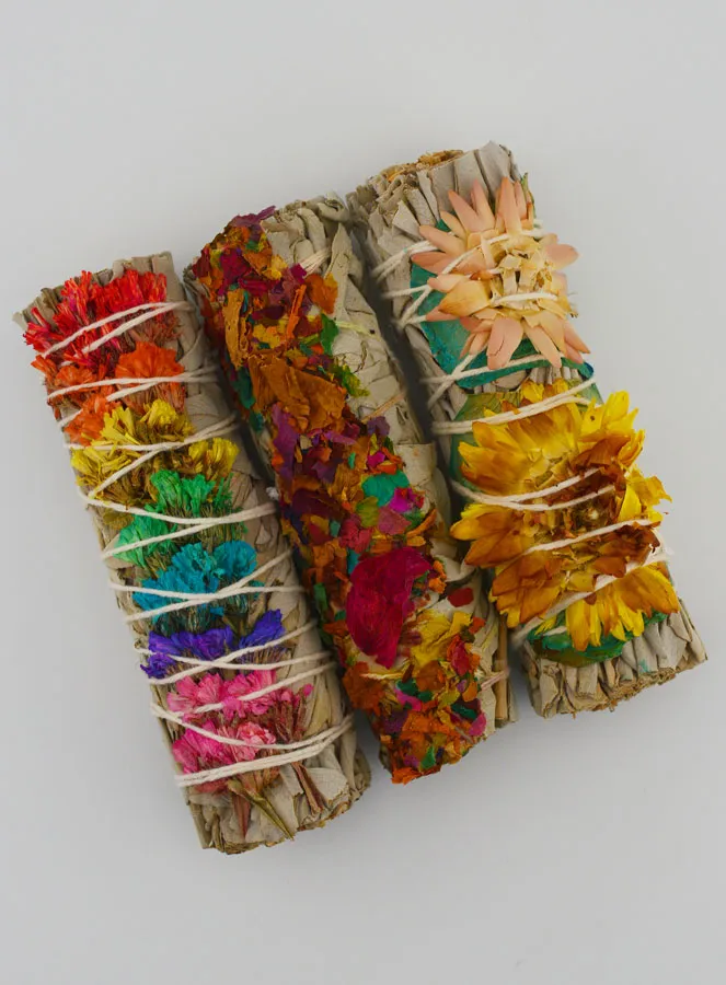 Set 3 smudge sticks sage and flower petals. This set of 3 sage smudge sticks can be used to purify the environment. Each bundle weighs approximately 25-30g and measures 10 x 3cm.