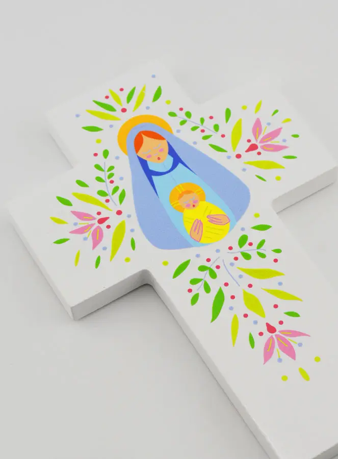 Wooden Baptismal Cross - Our Lady of Tenderness, this pretty wooden cross features a soft, colourful design painted on a white background.